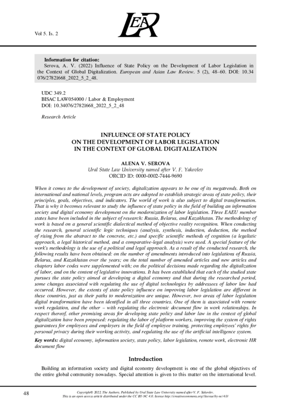 Статья: INFLUENCE OF STATE POLICY ON THE DEVELOPMENT OF LABOR LEGISLATION IN THE CONTEXT OF GLOBAL DIGITALIZATION