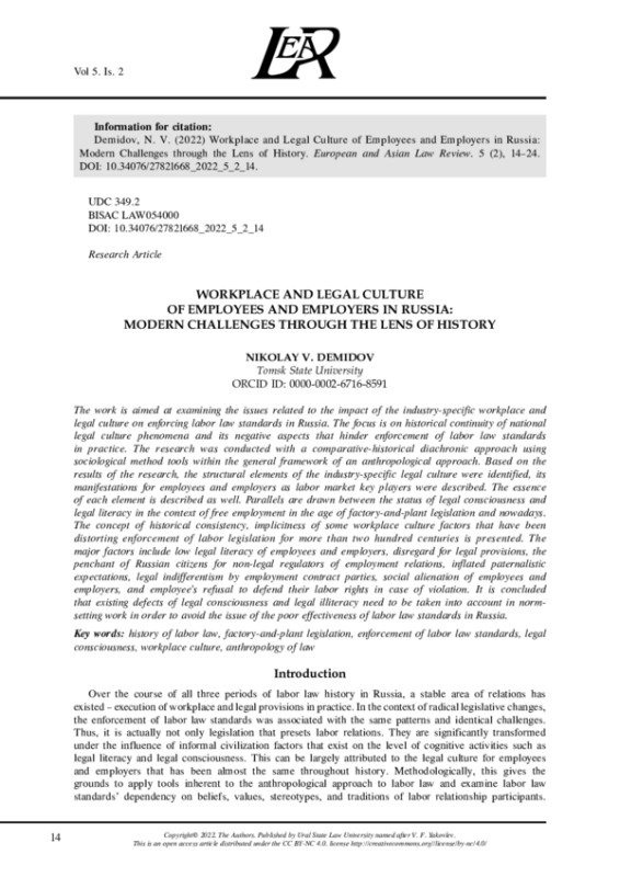 Статья: WORKPLACE AND LEGAL CULTURE OF EMPLOYEES AND EMPLOYERS IN RUSSIA: MODERN CHALLENGES THROUGH THE LENS OF HISTORY