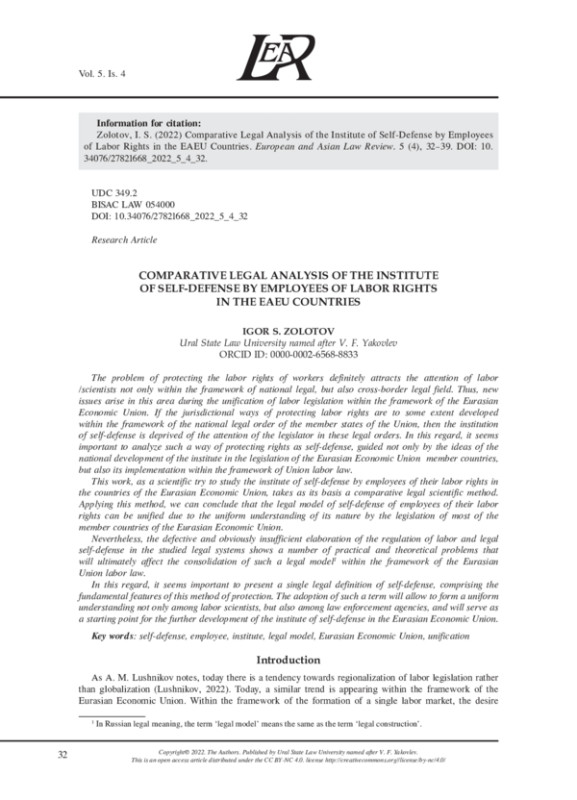 The problem of protecting the labor rights of workers definitely attracts the attention of labor /scientists not only within the framework of national legal, but also cross-border legal field. Thus, new issues arise in this area during the unification of labor legislation within the framework of the Eurasian Economic Union. If the jurisdictional ways of protecting labor rights are to some extent developed within the framework of the national legal order of the member states of the Union, then the institution of self-defense is deprived of the attention of the legislator in these legal orders. In this regard, it seems important to analyze such a way of protecting rights as self-defense, guided not only by the ideas of the national development of the institute in the legislation of the Eurasian Economic Union member countries, but also its implementation within the framework of Union labor law. This work, as a scientific try to study the institute of self-defense by employees of their labor rights in the countries of the Eurasian Economic Union, takes as its basis a comparative legal scientific method. Applying this method, we can conclude that the legal model of self-defense of employees of their labor rights can be unified due to the uniform understanding of its nature by the legislation of most of the member countries of the Eurasian Economic Union. Nevertheless, the defective and obviously insufficient elaboration of the regulation of labor and legal self-defense in the studied legal systems shows a number of practical and theoretical problems that will ultimately affect the consolidation of such a legal model1 within the framework of the Eurasian Union labor law. In this regard, it seems important to present a single legal definition of self-defense, comprising the fundamental features of this method of protection. The adoption of such a term will allow to form a uniform understanding not only among labor scientists, but also among law enforcement agencies, and will serve as a starting point for the further development of the institute of self-defense in the Eurasian Economic Union.
