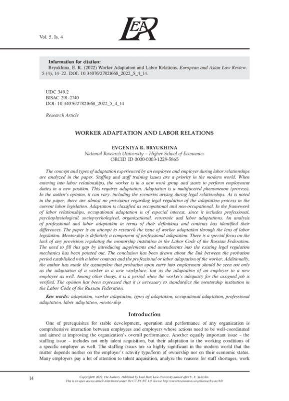 The conceptand typesof adaptationexperienced by an employee and employer during labor relationships are analyzed in the paper. Staffing and staff training issues are a priority in the modern world. When entering into labor relationships, the worker is in a new work group and starts to perform employment duties in a new position. This requires adaptation. Adaptation is a multifaceted phenomenon (process). In the author’s opinion, it can vary, including the scenarios arising during legal relationships. As is noted in the paper, there are almost no provisions regarding legal regulation of the adaptation process in the current labor legislation. Adaptation is classified as occupational and non-occupational. In the framework of labor relationships, occupational adaptation is of especial interest, since it includes professional, psychophysiological, sociopsychological, organizational, economic and labor adaptations. An analysis of professional and labor adaptation in terms of their definitions and contents has identified their differences. The paper is an attempt to research the issue of worker adaptation through the lens of labor legislation. Mentorship is definitely a component of professional adaptation. There is a special focus on the lack of any provisions regulating the mentorship institution in the Labor Code of the Russian Federation. The need to fill this gap by introducing supplements and amendments into the existing legal regulation mechanics has been pointed out. The conclusion has been drawn about the link between the probation period established with a labor contract and the professional or labor adaptation of the worker. Additionally, the author has made the assumption that probation upon entry into employment should be seen not only as the adaptation of a worker to a new workplace, but as the adaptation of an employer to a new employee as well. Among other things, it is a period when the worker’s adequacy for the assigned job is verified. The opinion has been expressed that it is necessary to standardize the mentorship institution in the Labor Code of the Russian Federation.