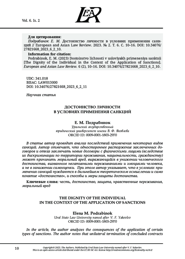 Статья: ДОСТОИНСТВО ЛИЧНОСТИ В УСЛОВИЯХ ПРИМЕНЕНИЯ САНКЦИЙ