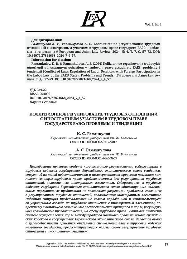 Статья: КОЛЛИЗИОННОЕ РЕГУЛИРОВАНИЕ ТРУДОВЫХ ОТНОШЕНИЙ С ИНОСТРАННЫМ УЧАСТИЕМ В ТРУДОВОМ ПРАВЕ ГОСУДАРСТВ ЕАЭС: ПРОБЛЕМЫ И ТЕНДЕНЦИИ