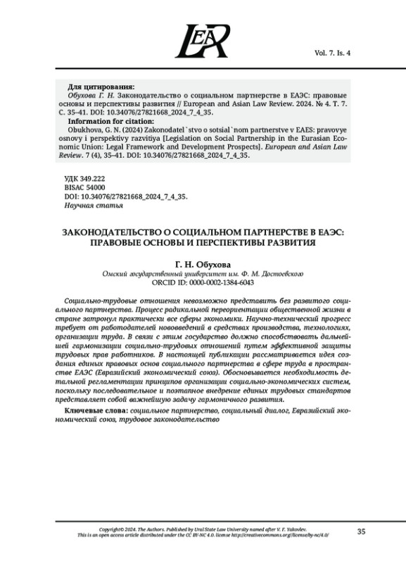 Статья: ЗАКОНОДАТЕЛЬСТВО О СОЦИАЛЬНОМ ПАРТНЕРСТВЕ В ЕАЭС: ПРАВОВЫЕ ОСНОВЫ И ПЕРСПЕКТИВЫ РАЗВИТИЯ