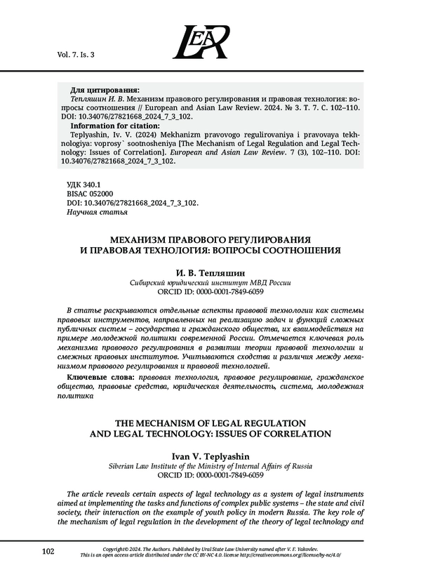 Статья: МЕХАНИЗМ ПРАВОВОГО РЕГУЛИРОВАНИЯ И ПРАВОВАЯ ТЕХНОЛОГИЯ: ВОПРОСЫ СООТНОШЕНИЯ
