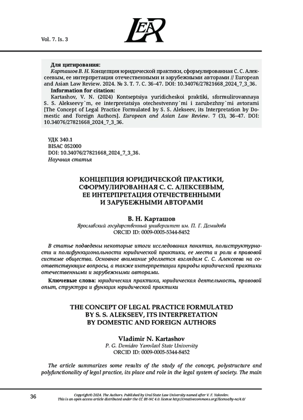 Статья: КОНЦЕПЦИЯ ЮРИДИЧЕСКОЙ ПРАКТИКИ, СФОРМУЛИРОВАННАЯ С. С. АЛЕКСЕЕВЫМ, ЕЕ ИНТЕРПРЕТАЦИЯ ОТЕЧЕСТВЕННЫМИ И ЗАРУБЕЖНЫМИ АВТОРАМИ