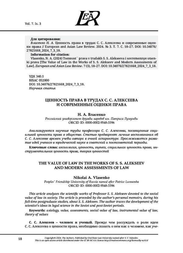 Статья: ЦЕННОСТЬ ПРАВА В ТРУДАХ С. С. АЛЕКСЕЕВА И СОВРЕМЕННЫЕ ОЦЕНКИ ПРАВА