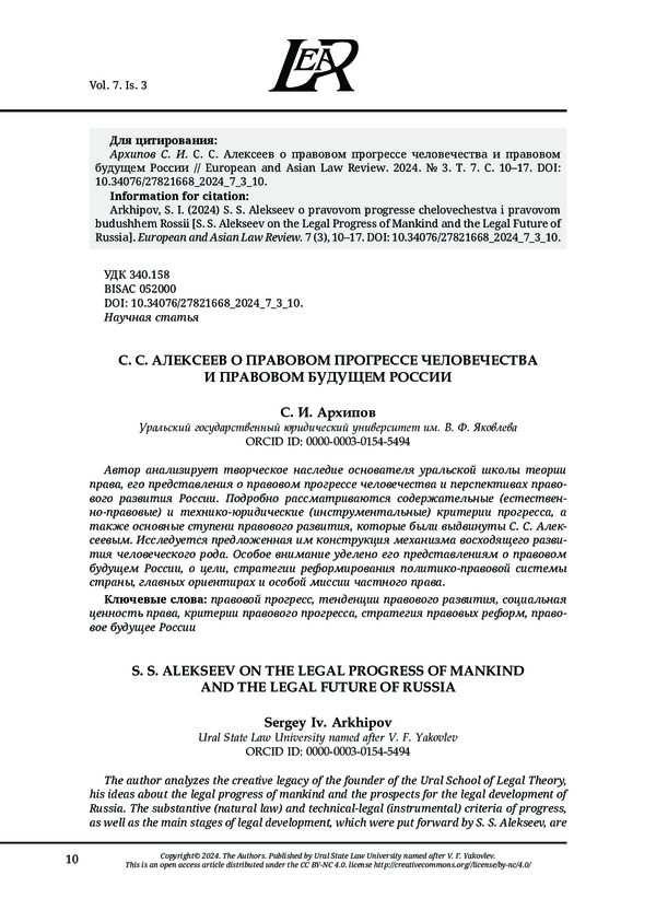 Автор анализирует творческое наследие основателя уральской школы теории права, его представления о правовом прогрессе человечества и перспективах правового развития России. Подробно рассматриваются содержательные (естественно-правовые) и технико-юридические (инструментальные) критерии прогресса, а также основные ступени правового развития, которые были выдвинуты С. С. Алексеевым. Исследуется предложенная им конструкция механизма восходящего развития человеческого рода. Особое внимание уделено его представлениям о правовом будущем России, о цели, стратегии реформирования политико-правовой системы страны, главных ориентирах и особой миссии частного права.