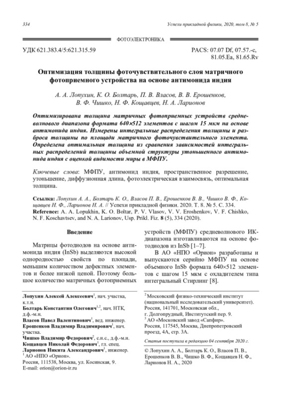 Статья: Оптимизация толщины фоточувствительного слоя матричного фотоприемного устройства на основе антимонида индия