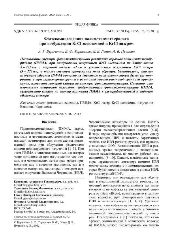 Статья: Фотолюминесценция полиметилметакрилата при возбуждении KrCl эксилампой и KrCl лазером