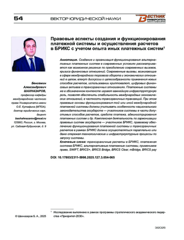 Статья: Правовые аспекты создания и функционирования платежной системы и осуществления расчетов в БРИКС с учетом опыта иных платежных систем