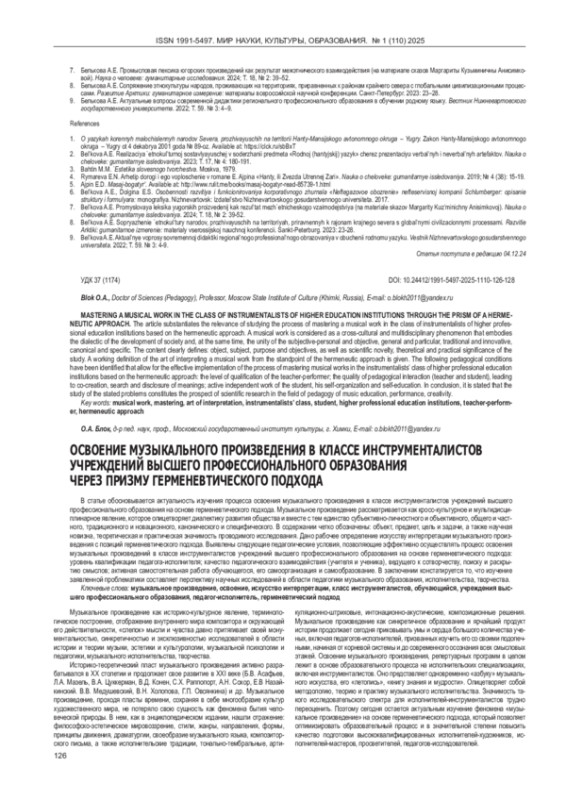 Статья: ОСВОЕНИЕ МУЗЫКАЛЬНОГО ПРОИЗВЕДЕНИЯ В КЛАССЕ ИНСТРУМЕНТАЛИСТОВ УЧРЕЖДЕНИЙ ВЫСШЕГО ПРОФЕССИОНАЛЬНОГО ОБРАЗОВАНИЯ ЧЕРЕЗ ПРИЗМУ ГЕРМЕНЕВТИЧЕСКОГО ПОДХОДА