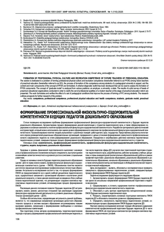 Статья: ФОРМИРОВАНИЕ ПРОФЕССИОНАЛЬНОЙ ФИЗКУЛЬТУРНО-ОЗДОРОВИТЕЛЬНОЙ КОМПЕТЕНТНОСТИ БУДУЩИХ ПЕДАГОГОВ ДОШКОЛЬНОГО ОБРАЗОВАНИЯ