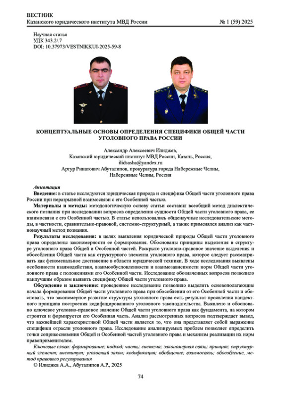 Статья: КОНЦЕПТУАЛЬНЫЕ ОСНОВЫ ОПРЕДЕЛЕНИЯ СПЕЦИФИКИ ОБЩЕЙ ЧАСТИ УГОЛОВНОГО ПРАВА РОССИИ