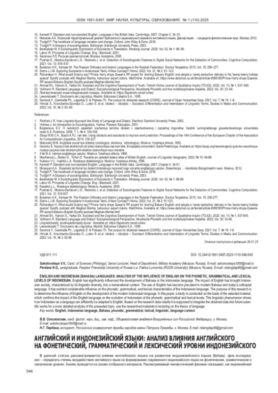В данной статье рассматривается влияние английского языка на развитие индонезийского языка (Bahasa). Цель исследова ния – определить степень воздействия английского языка на формирование современного индонезийского языка на фонетическом, грамматическом и лексическом уровнях. Анализ проводится на основе отобранного материала. Рассматриваемый лингвистический феномен показывает, как индонезийский язык может быть эффективно адаптирован к английскому. Использование английского стало преобладающим в современном языке Bahasa, что придает индонезийскому обществу, характеризующимся языковым разнообразием, транснациональный контекст. По результатам исследования предполагается интегрировать полученные данные в будущие научные работы для более детального анализа представленной темы, использовать исследованные материалы при чтении лекций по теории язык.