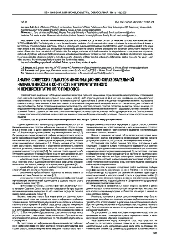 Советский плакат представляет собой один из важнейших медиаторов публичной коммуникации, осуществляемой между государством и гражданами в эпоху советского общества. Данный инструмент коммуникации включал в себя плакаты различного жанра, в том числе и информационно-образовательной направленности, которая на настоящий момент не является изученной в должной мере. В связи с этим данное исследование нацелено на исследование взаимосвязи между семантическими элементами плаката и его комплексной коммуникативной интенцией в контексте социально-культурных особенностей советского общества. Анализ, проведенный в рамках интерпретативного и нерепрезентативного подходов, подтвердил выдвинутую гипотезу и доказал, что информационно-образовательный советский плакат содержит в себе два основных коммуникативных намерения - образовательно-воспитательный и агитационный. Плакаты создавались в качестве воспитательного материала, мотивирующего на успешную учебно-трудовую деятельность; были нацелены на создание позитивного представления о новом советском человеке с успешным будущим в тех профессиональных сферах, в которых нуждалось советское общество.