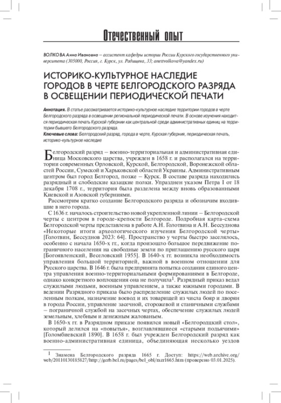 Статья: ИСТОРИКО-КУЛЬТУРНОЕ НАСЛЕДИЕ ГОРОДОВ В ЧЕРТЕ БЕЛГОРОДСКОГО РАЗРЯДА В ОСВЕЩЕНИИ ПЕРИОДИЧЕСКОЙ ПЕЧАТИ