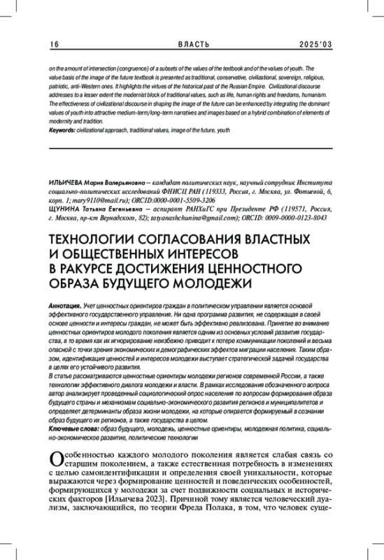 Статья: ТЕХНОЛОГИИ СОГЛАСОВАНИЯ ВЛАСТНЫХ И ОБЩЕСТВЕННЫХ ИНТЕРЕСОВ В РАКУРСЕ ДОСТИЖЕНИЯ ЦЕННОСТНОГО ОБРАЗА БУДУЩЕГО МОЛОДЕЖИ