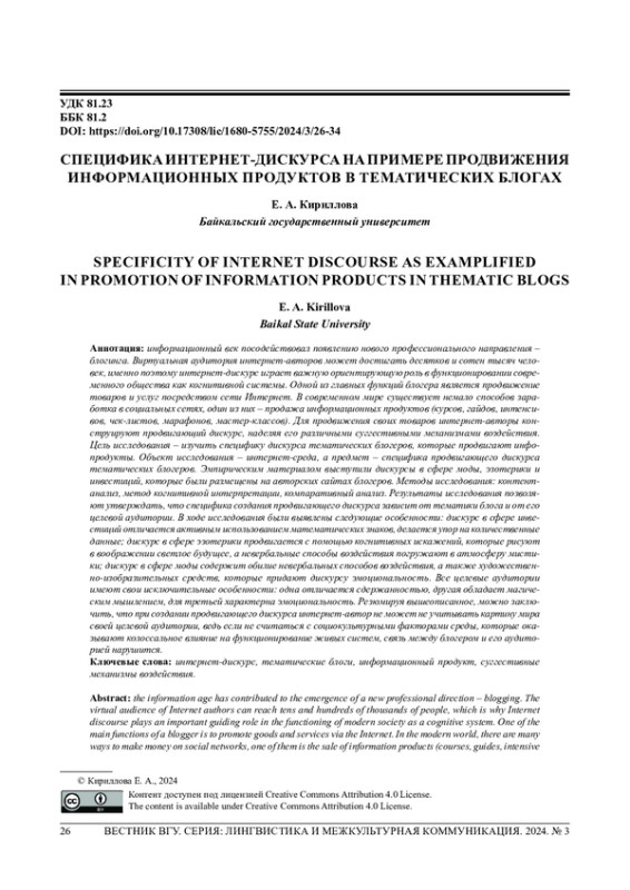 Информационный век посодействовал появлению нового профессионального направления -блогинга. Виртуальная аудитория интернет-авторов может достигать десятков и сотен тысяч человек, именно поэтому интернет-дискурс играет важную ориентирующую роль в функционировании современного общества как когнитивной системы. Одной из главных функций блогера является продвижение товаров и услуг посредством сети Интернет. В современном мире существует немало способов заработка в социальных сетях, один из них - продажа информационных продуктов (курсов, гайдов, интенсивов, чек-листов, марафонов, мастер-классов). Для продвижения своих товаров интернет-авторы конструируют продвигающий дискурс, наделяя его различными суггестивными механизмами воздействия. Цель исследования - изучить специфику дискурса тематических блогеров, которые продвигают инфопродукты. Объект исследования - интернет-среда, а предмет - специфика продвигающего дискурса тематических блогеров. Эмпирическим материалом выступили дискурсы в сфере моды, эзотерики и инвестиций, которые были размещены на авторских сайтах блогеров. Методы исследования: контент-анализ, метод когнитивной интерпретации, компаративный анализ. Результаты исследования позволяют утверждать, что специфика создания продвигающего дискурса зависит от тематики блога и от его целевой аудитории. В ходе исследования были выявлены следующие особенности: дискурс в сфере инвестиций отличается активным использованием математических знаков, делается упор на количественные данные; дискурс в сфере эзотерики продвигается с помощью когнитивных искажений, которые рисуют в воображении светлое будущее, а невербальные способы воздействия погружают в атмосферу мистики; дискурс в сфере моды содержит обилие невербальных способов воздействия, а также художественно-изобразительных средств, которые придают дискурсу эмоциональность. Все целевые аудитории имеют свои исключительные особенности: одна отличается сдержанностью, другая обладает магическим мышлением, для третьей характерна эмоциональность. Резюмируя вышеописанное, можно заключить, что при создании продвигающего дискурса интернет-автор не может не учитывать картину мира своей целевой аудитории, ведь если не считаться с социокультурными факторами среды, которые оказывают колоссальное влияние на функционирование живых систем, связь между блогером и его аудиторией нарушится.