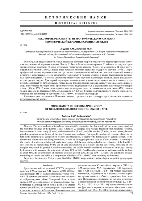 Статья: НЕКОТОРЫЕ РЕЗУЛЬТАТЫ ПЕТРОГРАФИЧЕСКОГО ИЗУЧЕНИЯ НЕОЛИТИЧЕСКОЙ КЕРАМИКИ СТОЯНКИ ЛУЖКИ II