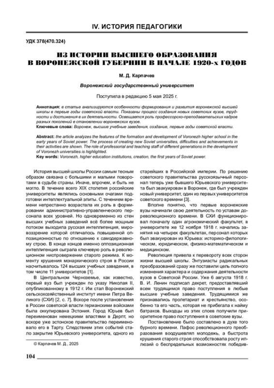Статья: ИЗ ИСТОРИИ ВЫСШЕГО ОБРАЗОВАНИЯ В ВОРОНЕЖСКОЙ ГУБЕРНИИ В НАЧАЛЕ 1920-Х ГОДОВ