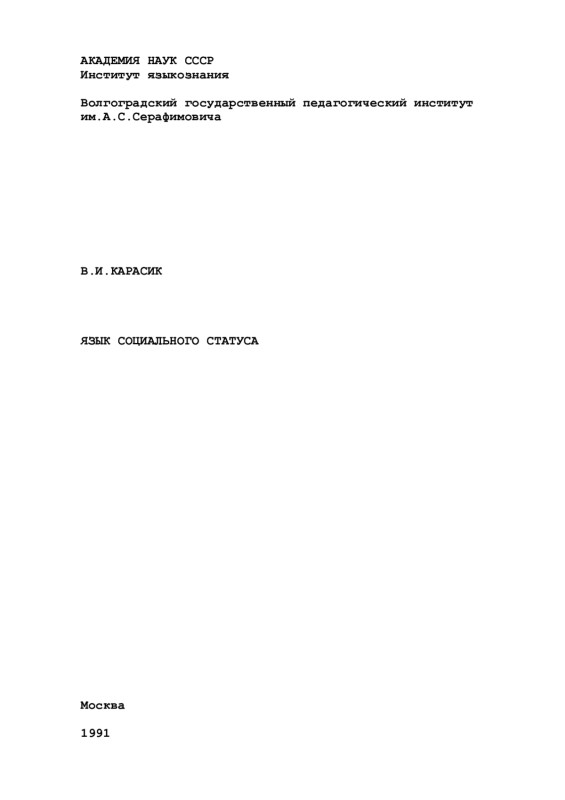 Карасик В.И. Язык социального статуса. - М.:Институт языкознания АН СССР, Волгоградский педагогический институт, 1991. - 495 с.