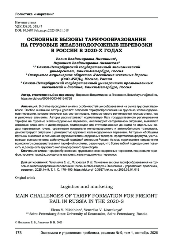 Статья: ОСНОВНЫЕ ВЫЗОВЫ ТАРИФООБРАЗОВАНИЯ НА ГРУЗОВЫЕ ЖЕЛЕЗНОДОРОЖНЫЕ ПЕРЕВОЗКИ В РОССИИ В 2020-Х ГОДАХ
