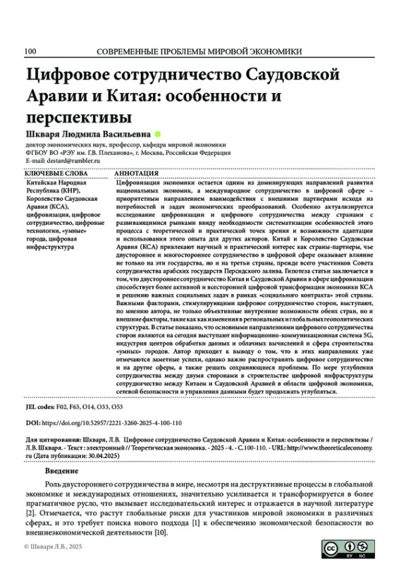 Статья: ЦИФРОВОЕ СОТРУДНИЧЕСТВО САУДОВСКОЙ АРАВИИ И КИТАЯ: ОСОБЕННОСТИ И ПЕРСПЕКТИВЫ