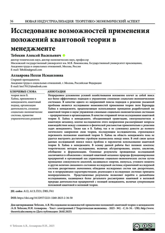 Статья: ИССЛЕДОВАНИЕ ВОЗМОЖНОСТЕЙ ПРИМЕНЕНИЯ ПОЛОЖЕНИЙ КВАНТОВОЙ ТЕОРИИ В МЕНЕДЖМЕНТЕ
