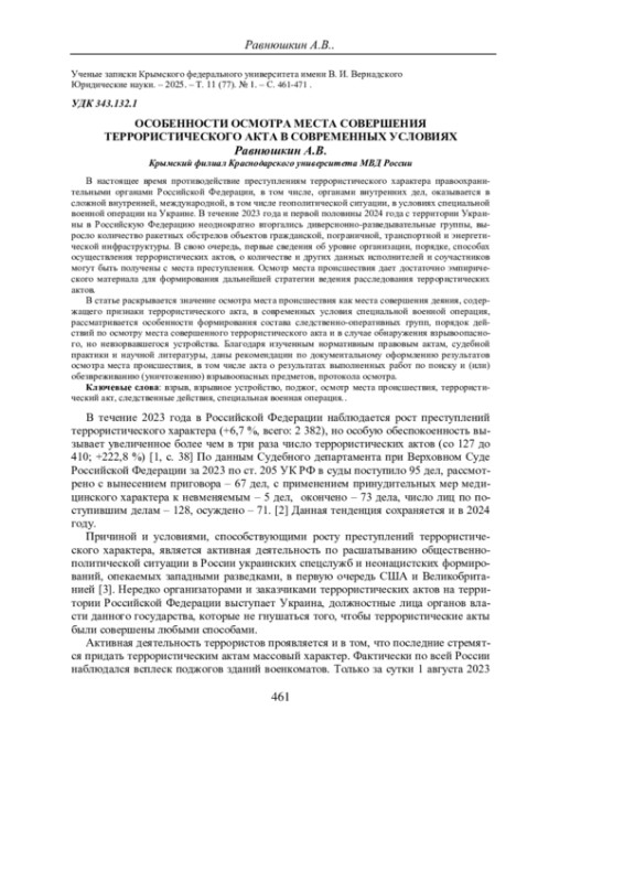 В статье раскрывается значение осмотра места происшествия как места совершения деяния, содержащего признаки террористического акта, в современных условия специальной военной операция, рассматривается особенности формирования состава следственно-оперативных групп, порядок действий по осмотру места совершенного террористического акта и в случае обнаружения взрывоопасного, но невзорвавшегося устройства. Благодаря изученным нормативным правовым актам, судебной практики и научной литературы, даны рекомендации по документальному оформлению результатов осмотра места происшествия, в том числе акта о результатах выполненных работ по поиску и (или) обезвреживанию (уничтожению) взрывоопасных предметов, протокола осмотра.
