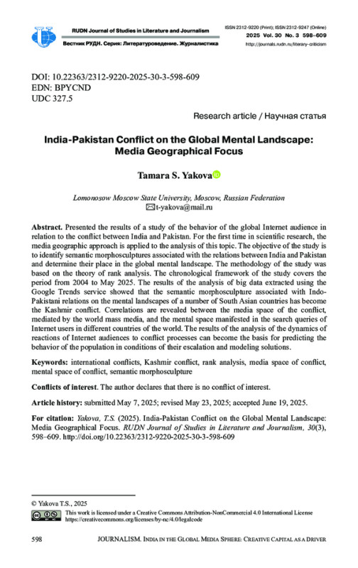 Представлены результаты исследования поведения глобальной интернет аудитории по отношению к конфликту Индии и Пакистана. Впервые в научных исследованиях медиагеографический подход применяется к анализу данной темы. Задача – выявить смысловые морфоскульптуры, связанные с отношениями Индии и Пакистана, определить их место на глобальном ментальном ландшафте, – решалась при помощи медиагеографического инструментария. Методология базировалась на теории рангового анализа. Хронологические рамки исследования охватывают период с 2004 по май 2025 г. Результаты анализа Big Data, извлеченных при помощи сервиса Google Trends, показали, что смысловой морфоскульптурой, связанной с индо-пакистанскими отношениями, в ментальных ландшафтах целого ряда стран Южной Азии стал кашмирский конфликт. Выявлены корреляции между медийным пространством конфликта, опосредованным мировыми средствами массовой информации, ментальным пространством, проявленным в запросах интернет-пользователей разных стран мира. Результаты анализа динамики реакций интернет-аудиторий на конфликтные процессы могут стать основой для прогнозирования поведения населения в условиях их обострения и моделирования решений.
