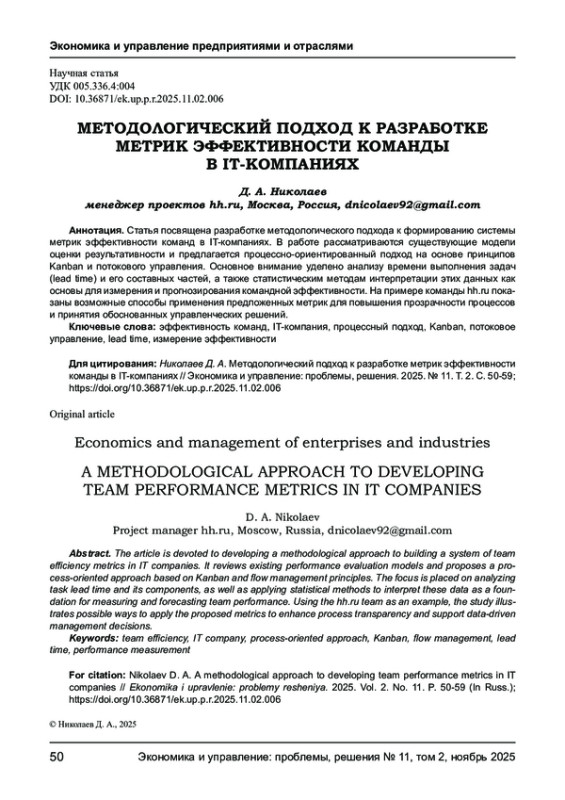 Статья посвящена разработке методологического подхода к формированию системы метрик эффективности команд в IT-компаниях. В работе рассматриваются существующие модели оценки результативности и предлагается процессно-ориентированный подход на основе принципов Kanban и потокового управления. Основное внимание уделено анализу времени выполнения задач (lead time) и его составных частей, а также статистическим методам интерпретации этих данных как основы для измерения и прогнозирования командной эффективности. На примере команды hh. ru показаны возможные способы применения предложенных метрик для повышения прозрачности процессов и принятия обоснованных управленческих решений.