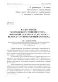 Статья посвящена исследованию многогранной деятельности выпускников Императорского Московского университета, — драматургов, писателей, издателей, актеров, певцов, постановщиков, внесших выдающийся вклад в развитие отечественной художественной культуры и русского театра середины — второй половины XVIII в. На материале анализа архивных данных по истории Московского университета, текстов «Драматического словаря» (1787) и «Драматического альбома» (1850), изданий пьес второй половины XVIII в. автор воссоздает картину деятельности выпускников Московского университета в истории русской сцены. Автор базируется на методологии комплексного текстового, иконографического и искусствоведческого анализа, что позволяет глубже показать историческое значение и роль студентов и выпускников университета в развитии театрального дела в России — не только играют, поют, ставят, но и пишут и переводят для своей сцены, — что способствовало развитию отечественного театрального искусства, русской оригинальной и переводной драматургии.